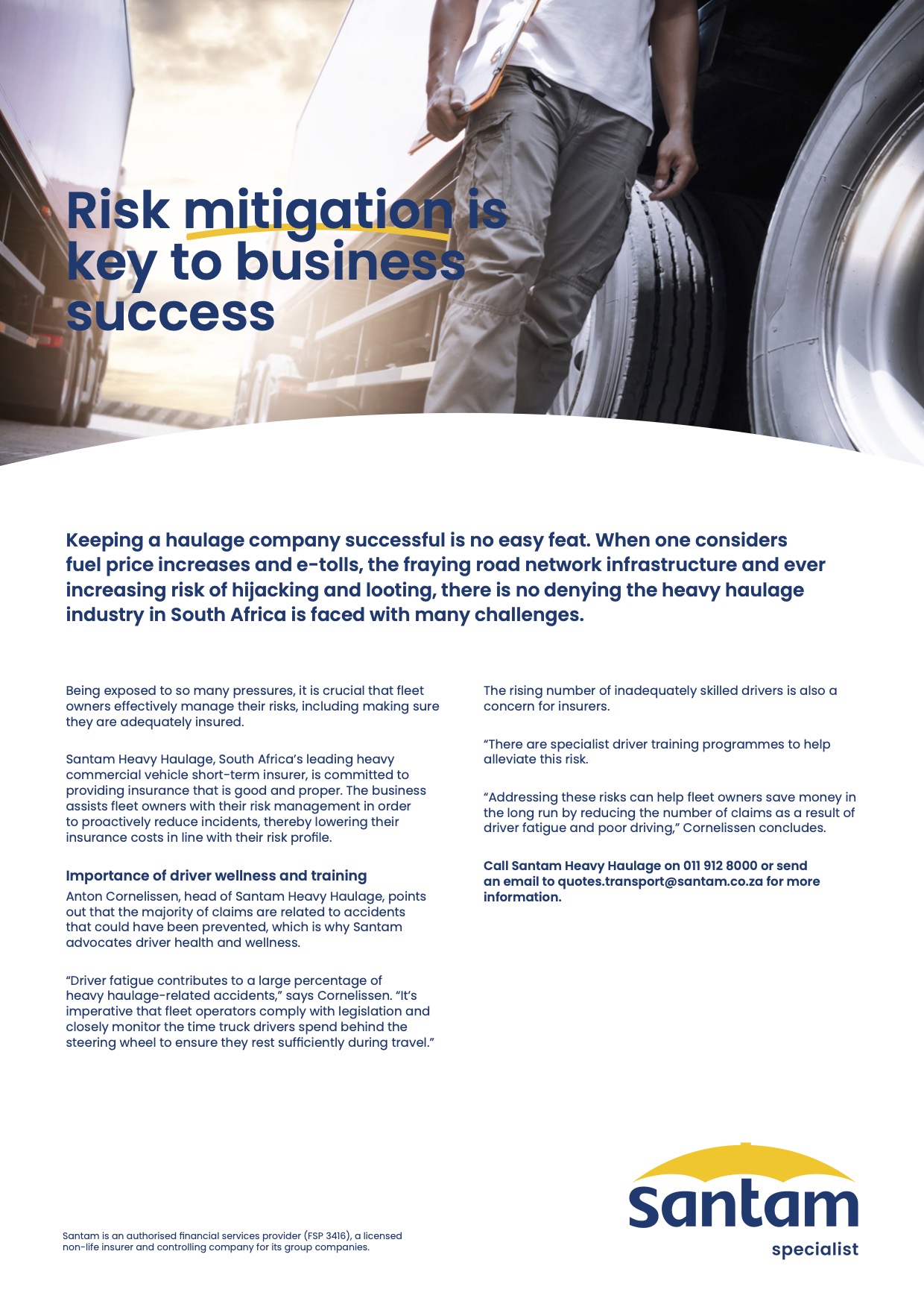 Santam Heavy Haulage, South Africa’s leading heavy commercial vehicle short-term insurer, is committed to providing insurance that is good and proper. The business assists fleet owners with their risk management in order to proactively reduce incidents, thereby lowering their insurance costs in line with their risk profile.
