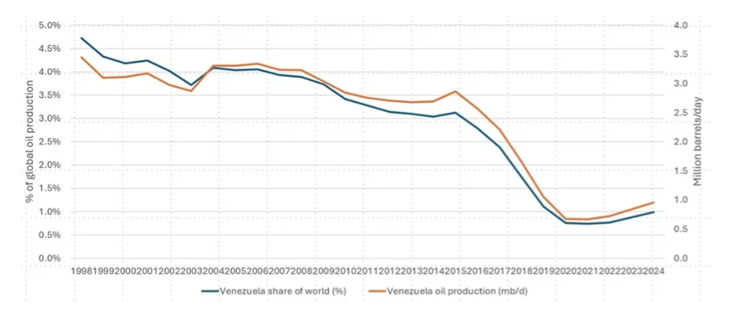 Venezuela’s strategic relevance stems from the scale of its reserves, nominally the world’s largest, rather than from its current production, which is less than 1% of the market. Output has fallen from peaks of more than 3.5 million barrels per day to around 1 million barrels per day today, following decades of mismanagement, underinvestment and governance failures. Oil still accounts for more than 90% of Venezuelan exports, leaving the economy acutely exposed to disruption in the sector.