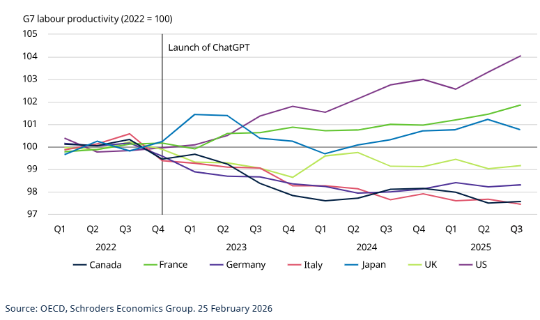 If AI were displacing workers meaningfully, there ought to be a clear improvement in labour productivity. Yet outside the US, there has been no discernible acceleration, suggesting that AI’s impact on G6 job markets has been limited so far.