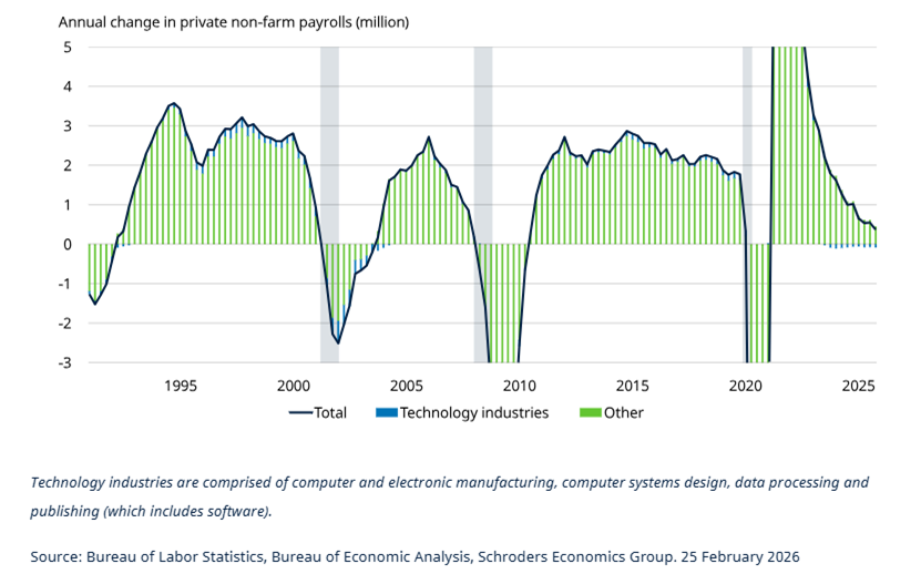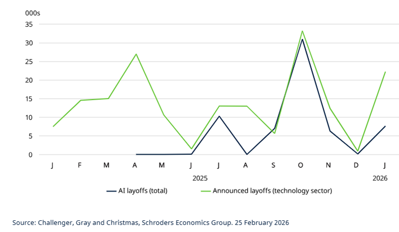 AI is increasingly being cited in US layoff announcements, with nearly 5% mentioning it in 2025. But these appear to be concentrated in the technology sector, which intuitively makes sense given the capex ramp-up in recent years.