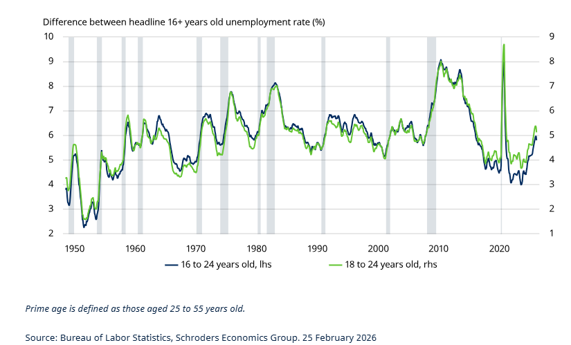 Another popular argument is that firms are no longer hiring entry-level roles because AI can perform many junior tasks. Yet measures of youth unemployment have not seen a structural departure from the prime age unemployment rate, suggesting that AI is not impacting labour demand at the margin.