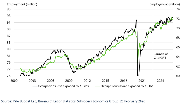 While we have established that AI has not led to a significant number of layoffs, it could still be weighing on job creation more broadly across the US economy. But a bottom-up analysis of occupational exposure to AI suggests there has been little difference between jobs more at risk of being automated than those less at risk since 2022.