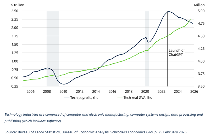 It is also notable that payroll employment for the sector peaked just after ChatGPT was launched. But factors unrelated to AI are also likely to have played a part. Over-hiring during the pandemic may be partially to blame, while the higher interest rate environment since the pandemic has been a significant headwind to the sector.