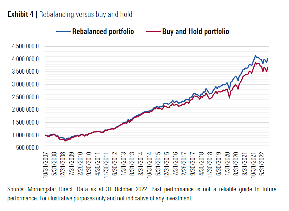 The graph below shows two identical portfolios - one that is rebalanced quarterly, and one that follows a buy-and-hold strategy. We can clearly see the value that rebalancing provides over time, with the rebalanced portfolio adding just over R350 000 in value at the end of a 15 year investment horizon.