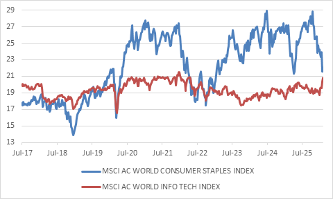 This brings us to a second prominent gap in equity valuations. Until recently, technology shares traded at a significant premium, partly driven by the excitement around AI, though it predates AI by some years. In essence, investors were prepared to pay up for businesses that were able to scale up without encountering diminishing returns, grow earnings rapidly and do so while remaining relatively asset light. Once software is written, it can be replicated infinitely and cheaply, unlike traditional “asset heavy” businesses where each unit produced requires significant capital investment.