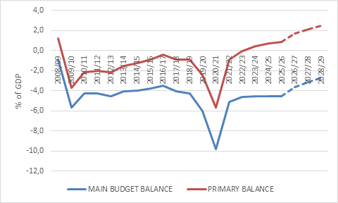 However, if interest payments are excluded, a much better picture emerges. This is the so-called primary balance, which has been in surplus for the past three fiscal years (including the current one) and is projected to increase further over the medium term. This essentially means that revenues now cover non-interest spending, with a bit left over to start paying down debt.