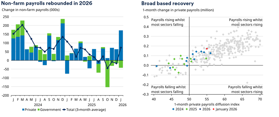 Whether it be high costs pressuring margins or the belief that humans can be replaced with AI agents, the lack of job growth has spooked the market. Our view was that corporates were merely waiting for more certainty over Trump’s protectionist policies. While there is unlikely to ever be certainty, corporates see a far brighter future than they did back in April 2025. We also saw 150k public sector job losses in October 2025, which was the delayed impact of Elon Musk’s Department of Government Efficiency (DOGE) program. However, in January this year we saw a market improvement with 130k new jobs being created, well above the 65k expectation. Pleasingly, this was mostly all in the private sector, showing a rebalancing of the economy from public to private and an improvement in private job needs. While some will say most of the job gains were in the health sector (which is true), job growth was seen across all sectors, implying a broad-based recovery. We will continue to watch jobs in the US, but our thesis remains the US economy will be strong in 2026.