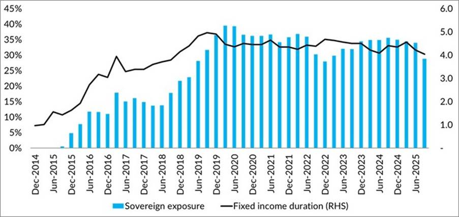 We see a similar trend across South African credit markets, with substantial demand for these instruments even at yields that we don’t believe fully compensate investors for the credit risk. With credit expensively priced, in our view, we have much less credit today than we have historically held. The decline in credit holdings in PSG Stable Fund as credit becomes less attractive (illustrated by the 5-year NCD credit spread) is evident in the chart below.