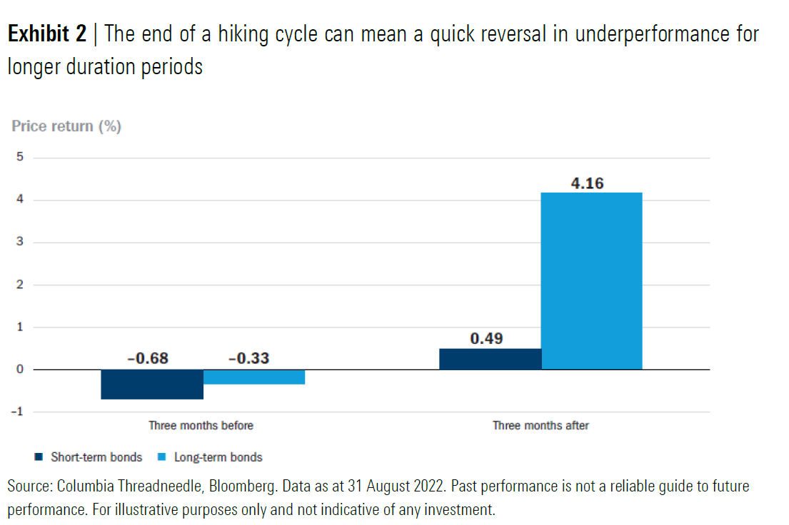 The below graph shows the return of bonds three months before and after a rate hikingcycle ends. As can be seen in this graph, returns on both short-duration and long-durationbonds are negative. However, in the three months after a rate hiking cycle ends, returnsfor long-duration bonds are especially sizeable.